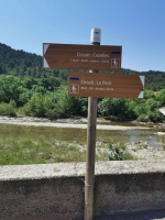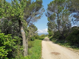 213 m, 31 T 487811 4800768.Laisser les chemins venant de gauche et continuer jusqu’au hameau. Dans Cazelles, traverser la D 176 “prudence” et aller tout droit sur la D 175 E1 vers Aigues Vives et Paguignan. Traverser le hameau, puis tourner à gauche vers Agel la D 176 E1. Après 30 m, quitter la route et aller à droite sur le chemin de terre. Au croisement, descendre tout droit, laisser plus loin le chemin de gauche dans la patte d’oie et parvenir à un croisement.