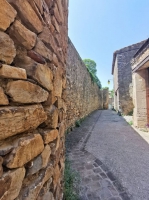 151 m, 31 T 487456 4799604Au croisement, partir en face : emprunter le sentier en contre-bas de la vigne qui serpente à couvert. A la vigne, partir à gauche puis à droite le long du muret. Rejoindre la route, descendre à gauche. À l’entrée du village, quitter la route à gauche, contourner le moulin. Descendre dans le village par les ruelles, longer le château, traverser la route et rejoindre le parking.