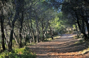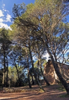 63 m, 31 T 502909 4802471Devant le platane, prendre à gauche. Plus loin, ignorer la route à gauche et monter tout droit. A l’orée de la pinède, à la fourche, prendre à gauche, puis encore à gauche et à la suivante, à droite. Bien suivre le balisage. Poursuivre en ignorant les autres pistes sur 1 km jusqu’à un croisement. Aller à droite et, au cabanon de vigne, monter à droite. Plus loin, tourner à gauche vers un mas.