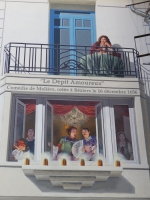 Monsieur Poquelin et sa troupe ont connu quelques déboires. Mais la protection du Duc d'Orléans, frère du Roy et gouverneur du Languedoc, établi fort confortablement à Pézenas, permet à Molière et aux siens de créer, jouer, divertir et attirer un public de plus en plus nombreux. Ainsi en 1656, un an avant de quitter définitivement le Languedoc, Molière crée à Béziers une pièce en 5 actes, "le dépit amoureux". Elle est donnée place de l'Ancienne Comédie (juste derrière l'immeuble où est peinte cette fresque).