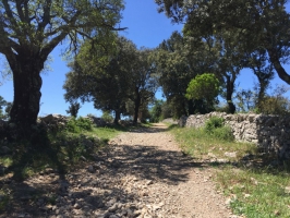 6.Contourner le domaine par la gauche, et rejoindre la D32. La traverser (Attention !!!) prendre en face et rejoindre un carrefour agrémenté de barrières vertes. Poursuivre en face sur une draille bordée de murets pour atteindre une barrière. Prendre à gauche sur 700m pour rejoindre le centre de Viols-le-Fort.