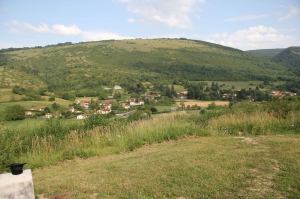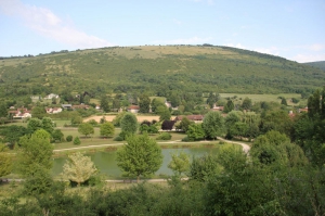 Circuit n° 109.Parcours : Prendre à droite en direction de la chapelle. A la croix, traverser. La montée au Mont Myon commence ici, longer le mur d’enceinte du château (18e siècle) construit par la famille Goyffon. (Possibilité de monter à la table d’orientation). Redescendre et passer derrière le Mont Myon, côté Jura. Retour au plan d’eau en longeant une combe, tout près de la grotte des Bornets, explorée dès 1909, par Pierre Piquet. Montée et descente du mont Myon difficiles.