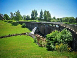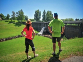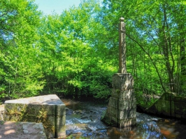 Descendre au bord du lac et tourner à droite sur le chemin qui serpente en bordure de la rive et mène au barrage. Descendre à droite en contrebas de l’ouvrage. La voie à droite conduit au poteau de quintaine puis au parking du barrage, à 250 m.