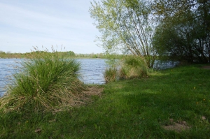 Observatoire pour regarder discrètement les oiseaux d’eau (foulques, grèbes, etc.). Continuer la piste vers le nord au milieu d’une forêt de pins.