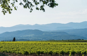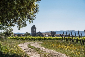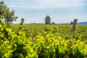 Une immersion en vignoble du Cru La Livinière, paysages du Minervois et panorama sur les Pyrénées.Les caveaux pour déguster au retour du parcours.Le clocher emblématique de La Livinière.