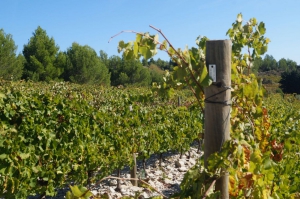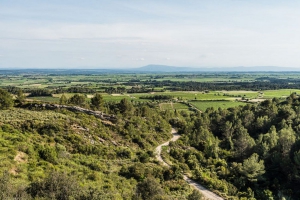 > Accès point de vue, aller-retour : emprunter à gauche la piste puis le sentier. Panorama sur Félines-Minervois. Voir le conservatoire de vignes.4. Tourner à droite et suivre la piste serpentant entre les vignes puis descendant vers Sainte-Eulalie. Au domaine, monter à gauche par la route pendant 1km. Dans un virage en épingle, emprunter à gauche la route et la traverser (prudence). A droite, monter la route qui s'engage en crête le long de vignes. Cheminer sur la piste principale pendant 1km.