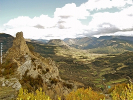 Gravir le sentier à gauche. Il mène aux ruines du château bâti sur sa vire. Poursuivre par le sentier qui bascule derrière la falaise, plein nord, et qui ne tarde pas à grimper en lacets (prudence aux chutes de pierres aux abords des ruines). Le panorama s’ouvre sur la combe de Chalancon au nord et la cuvette de la Motte au sud. Atteindre le croisement du <strong>Rocher de <strong>Chalancon (alt. 1025m)</strong>.