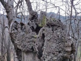 Vous êtes dans une châtaigneraie greffée, c’est-à-dire que l’homme entretenait et récoltait ses fruits pour une consommation familiale. Les arbres énormes autour de vous ont environ 300 ans. Les châtaignes étaient séchées dans une clède, petit bâtiment construit sur deux niveaux qui était soit près des habitations, soit en pleine forêt. La clède fonctionnait un mois entier en automne et permettait de conserver les châtaignes « blanchettes » toute l’année.Le châtaignier appelé « l'arbre à pain » tant il était vital pour la subsistance des hommes, était aussi utilisé pour faire des poutres, des tonneaux, des paniers, des ruches-troncs… ; il nourrissait les animaux et leur servait de litière.