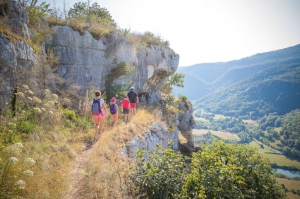 Un val typiquement jurassien suspendu entre la vallée du Suran et les Gorges de l'Ain. Paysage karstique, belvédères, réserve naturelle, forêts, falaises, traces de dinosaures... une grande randonnée qui foisonne de points d'intérêts.