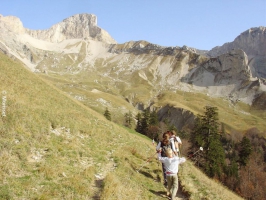 Prendre le sentier qui part complétement à gauche au pied de hêtres remarquables et qui sort dans l’alpage en balcon sur le vallon de la Jarjatte.