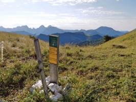 Poursuivre à gauche par le sentier à flanc qui cheminedans la hêtraie-sapinière, puis passe deux courtes marnes un peu aériennes avant de rejoindre le <strong>Col de Grimone (alt. 1318m)</strong>.
