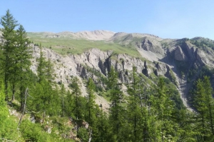 Arbre roi dans les montagnes des Alpes du Sud, le mélèze est le seul conifère à perdre ses aiguilles en hiver. Ses cônes, au printemps, sont d'un violet sombre caractéristique. Le mélèze est une des rares essences européennes imputrescibles (qui ne pourrit pas). C'est pourquoi malgré sa torsion au séchage il est beaucoup utilisé dans les charpentes, les abreuvoirs et autres rigoles des villages montagnards. Incapable de se régénérer sous son propre sous-bois, il a besoin d'ouvertures naturelles, parfois créées par des avalanches, pour que les jeunes pousses se développent. On le retrouve jusqu'à plus de 2200 mètres d'altitude, où il adopte alors des formes naines dans ces zones dites "de combat". Le mélèze présenté en ce point de la randonnée est plusieurs fois centenaire.