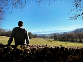 2 - Depuis le haut du village, descendre face aux Pyrénées en direction de la D81. Filer tout droit près de l’abri bus, descendre en longeant les champs à travers le sentier encadré de murets de pierres sèches.