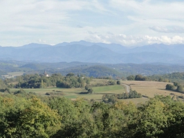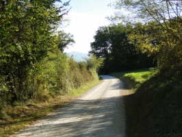 5 - A la sortie de l’abbaye, monter à gauche dans le chemin en cailloux blancs. A la D81 (grande route), traversez en face, puis 1ère à gauche et jusqu’au sommet du chemin. A gauche, suivez en crête le chemin en cailloux blancs. Profitez de la vue panoramique sur les Pyrénées.