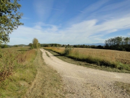 3 - Au ruisseau, tourner à gauche dans le champ, et poursuivez jusqu’au hameau « la Chourelle ». Suivre le chemin goudronné, monter à gauche. Prendre ensuite la 1ère à droite vers la grange cistercienne de la Peyrère.