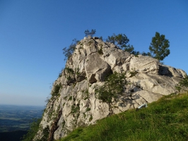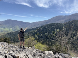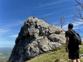 6 - Montez dans la forêt pour rejoindre la crête. Montez sur la droite vers le sommet par chemin de crête. Vous arrivez sur le Rocher de Pène Blanque ! La vue est superbe par temps clair. La vallée de la Garonne s'offre à vous. Soyez prudent sur le rocher, la falaise est dangereuse.