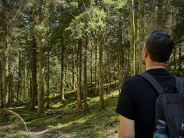 3 - A la fourche suivante à trois voies, montez la voie balisée la plus à gauche. Poursuivre, sur la route forestière (vous rencontrez des balises VTT).