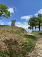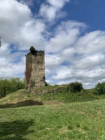 2 - Au rond-point, montez à gauche et gravissez la rue du château jusqu'au lotissement de Gourrinon. Au bout de la route poursuivez dans le chemin de terre sur 500m. Vous arrivez au croisement en T.