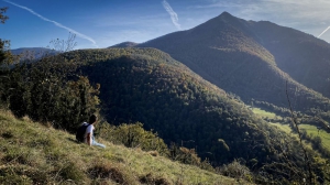 5 - Le chemin continue de monter dans la forêt, à flanc de colline. Vous arrivez sur une clairière avec une sublime vue sur le village de Juzet-d'Izaut, le Pic de Cagire et la petite vallée du Thou (Arguenos, Moncaup, Cazaunous). Profitez de cette belle vue !