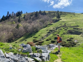 2 - Vous poursuivez tout droit et quittez le chemin, qui lui continue sur la gauche. Vous cheminez entre les champs et l'ascension du Mont Calem débute. Le Mont Calem, de part ses caractéristiques géologiques, possède peu de végétation composée essentiellement de bruyères et fougères.