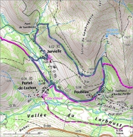 3 - Au bout de celle-ci (1335m), prenez le sentier partant sur votre droite en direction du village de Poubeau. Ce sentier en balcon surplombe le village de Jurvielle.