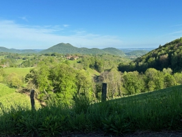 4 - Au Col de Larrieu, prenez immédiatement à gauche. Le sentier redescend alors vers la vallée et le hameau de Bordes, puis le hameau de Bataille. Traversez le hameau de Bataille et prenez sur la droite le Chemin du Moulin. Ce chemin devient un sentier dans la forêt. Poursuivez sur celui-ci. Vous atteignez le hameau de Peyréou.