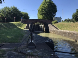 4 - Portion d'itinéraire réservée aux randonneurs pédestres et VTT, cavaliers voir modification d’itinéraire.Continuer tout droit. Longer le ruisseau de l'Amadou, puis le Canal du Midi jusqu'à une intersection. Tourner à droite, emprunter la passerelle pour passer l'écluse de Ticaille. Longer la maison éclusière et le Canal du Midi pour rejoindre l'écluse du Sanglier. Vous passerez sur l'aqueduc de l'Amadou et le port des Landes. Franchir le canal.