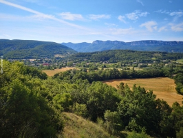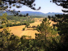 ::D/A:: Dos au parking de Grande Usine Moulinage (alt. 245m) partir à gauche puis prendre la 1ère rue à droite pour emprunter le pont au-dessus du Roubion. Poursuivre à gauche dans la ruelle et rejoindre plus loin Le Château (alt. 250m). ::1:: Continuer tout droit dans la rue du Château, en direction des Côtes, puis toujours tout droit sur le chemin de Montuel. S’élever entre les maisons puis quitter le goudron pour monter à droite sur un chemin. Suivre le chemin en sous-bois, arriver à un dégagement avec vue sur le village de Pont-de-Barret (à gauche). Passer une poche humide (type marécage après la pluie) puis une montée courte mais raide (prudence). Continuer à droite sur le chemin qui finit par s’élargir. ::2:: Monter à droite sur un large chemin herbeux pour contourner un ravin puis continuer à gauche. Attention le sentier est peu marqué au sol, bien suivre le balisage. Descendre un talus puis continuer à droite. Après une petite montée, descendre à gauche sur un chemin étroit et pentu (prudence) qui oblique vers la droite. Remonter, passer un petit pierrier puis un 2e, plus grand. Continuer à s’élever doucement en sous-bois puis prendre à gauche un sentier de nouveau plat. Passer un tas de pierres, continuer et déboucher sur une piste aux Côtes (alt. 306m). ::3:: Prendre la piste à droite en direction de Sainte-Euphémie. Après un virage à droite, la piste rétrécit pour devenir finalement un sentier. Le sentier en montée offre de beaux dégagements sur la vallée du Roubion. Poursuivre sur le chemin pour atteindre plus haut la crête de la montagne de Sainte-Euphémie. Chemin en balcon avec vue dominante sur la plaine. Atteindre Sainte-Euphémie (alt. 510m), de là, possibilité de rejoindre le Belvédère des Fours, à quelques mètres pour admirer le paysage à 180°. ::4:: Continuer pour rejoindre 100m plus loin le Petit Plat (alt. 511m). Amorcer la descente en direction du Pas de l’Oursière, que l’on rejoint par un agréable chemin en sous-bois. Au Pas de l’Oursière (alt. 480m) continuer tout droit vers Les Buis. Passer un pierrier. Belle vue sur les falaises de la montagne d’Eson. ::5:: Rejoindre le carrefour Les Buis (alt. 360m) et descendre en direction du Château. Attention aux cailloux qui roulent sous le pied en descente. Hors boucle, face à une ruine, il est possible de prendre à gauche pour faire l’aller-retour à la Vierge qui surplombe le village de Pont-de-Barret (5 à 10mn). Au Château (alt. 250m) prendre à gauche pour revenir au point de départ par le même chemin. ::D/A::