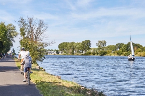 Suivre ensuite la piste cyclable en traversant le canal sur le pont-tournant et gagner Hérouville-Saint-Clair. Après le pont-tournant, longer le canal par le chemin de halage aménagé en piste cyclable.