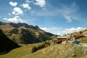 Juste avant d’arriver à Saint-Véran, au premier plan le Pic Cascavelier n’est pas encore sous la neige. Au fond de droite à gauche, la pointe des Marcelettes, le Rocher Blanc, le Pic Marcel et la pointe des Avers.