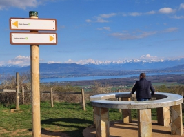 Magnifique point de vue à 755 m d'altitude la vue est à 360°, sur le bassin lémanique, Genève et l'arc Alpin avec le Mont Blanc, d'un côté, et vue sur la Haute Chaîne du Jura .Point de vue accessible depuis Mourex, ou Grilly.