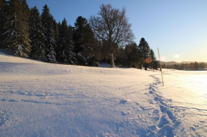 (3) Après environ 500 m, vous débouchez sur un milieu plus ouvert. Le parcours longe et se situe entre les deux pistes de ski de fond jusqu'à la prochaine intersection.