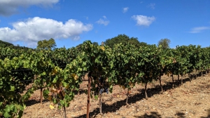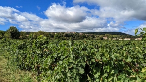 Traverser la départementale (prudence) et descendre à gauchedans la combe. Franchir un ruisseau, remonter et longer un champ à droite sur quelques centaines de mètres. Redescendre à droite en bout de champs, franchir à gué un ruisseau intermittent et continuer sur une piste en bordure de vignes, sous la route. Poursuivre tout droit et remonter en face sur la butte.
