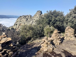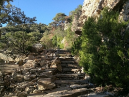 Traverser la passerelle des Soupirs et prendre à gauche le Sentier des Gardes. Vous commencerez une montée soutenue par un sentier caladé et ombragé par des chênes verts. Suivez le balisage PR (jaune) pour rejoindre le carrefour Saint-Martin (altitude 703 m). Prendre à gauche (balisage trail) en direction de la table d’orientation du Caroux en quittant le balisage jaune .
