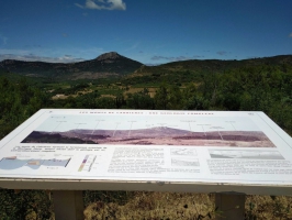 Passer le pont à droite et marcher le long de la route de Péret (attention à la circulation !). À la sortie du village, quitter la route et monter à gauche sur une piste DFCI, jusqu’au panneau d’interprétation des mines de cuivre.