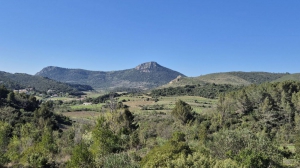 À hauteur d’un terre-plein et de vignes, en bas du chemin, laisser le chemin principal (retour direct vers le village de Cabrières) et tourner à droite. Contourner les vignes suivantes par la droite sur 350 m. Obliquer à droite par une sente étroite. Franchir le ruisseau de Néburelles, remonter vers des oliviers et atteindre une route. Monter à droite sur 200 m. Se diriger à gauche en direction du Pioch Farrus, longer les anciennes mines (fermées au public).