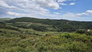 > Accès à la mine de la Roussignole et sa cheminée d’aérage (1 km A/R) : descendre à droite. Plus bas, franchir un ruisseau par un passage aménagé (marches). Monter sous les pins par un sentier ombragé. Passer devant la mine de la Roussignole. Prendre à gauche, puis accèder à la cheminée d’aérage. Revenir sur ses pas (point de vue sur le Soureillé d’Izarne et la vallée des Pitrous).Poursuivre la montée jusqu’au Pioch de Jaffet. Se diriger à gauche, passer la barrière. Continuer tout droit et contourner le Pioch (point de vue sur le village de Cabrières et le Pic de Vissou). À gauche, retrouver le chemin et poursuivre la montée par la piste DFCI, sur 50 m.