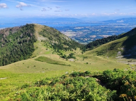 (5) Au sommet du Colomby de Gex, profiter de la vue, puis rejoindre le GR (balisage rouge et blanc) en direction du Grand Montrond. Suivre cette crête vallonnée jusqu’à l’alpage du Crozat, puis atteindre le croisement de la Vie de Chaux.