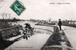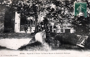 1 - Suivre la rigole sur la rive droite. Traverser successivement l’Avenue des Bourdettes, l’Avenue de St-Ferreol, le chemin du Pont du Riat*, la Route de Vaudreuille, passer devant la Maison de la Badorque* et la passerelle métallique. Continuer sur 250m.