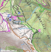 1ère option : 1 - De l’angle Nord-Est du parking de Téchous. Descendre la pente en suivant le balisage, poursuivre sur un chemin forestier, une dizaine de lacets qui mène à un chemin forestier plus large.