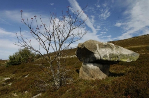 2/ Monter le sentier le plus à droite en longeant la clôture. Emprunter l’escabeau pour rentrer dans le parc (jasseries sur la gauche) ; monter tout droit pour en franchir un second. Au niveau du jas en ruine, continuer à droite ; traverser une zone de tourbière et poursuivre dans la lande à callunes et myrtilles.