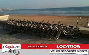 Location vélos, VAE, rosalies et scooters.Au pied des pistes, découvrez à vélo, en tandem, ou en vélos électriques le Pays des Olonnes ! Pédalez sereinement ... Évadez-vous ... Véritable professionnel de la location de cycles depuis 1974, nous vous proposons une large flotte de vélos et 3 points de location ! - A la Pendule - Piste de karts à pédales (face au Casino des Pins) - Concessions MBK, YAMAHA (rond-point E.Leclerc) Vélo de ville, VTC, VTT, tandem, vélo enfants, remorques enfants, sièges enfants, vélo-suiveur, casques, vélo à assistance électrique, scooters 50cc et 125cc. Rosalies pour 2 à 6 personnes : à partir de 25€ (1/2h). De février à juin : tous les jours 10h-12h30 & 14h30-18h30. Juillet et août : tous les jours 9h30-12h30 et 14h-19h30. Septembre-octobre : tous les jours 10h30-12h30 & 14h30-18h. Vélo électrique à partir de 30€/jour. Le Cyclotron, c'est aussi la livraison de votre vélo sur votre lieu de vacances, assistance et dépannage gratuit, ainsi que la location de scooters 50cc et 125cc.