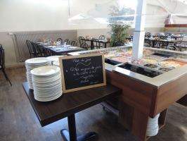 Nous sommes un restaurant ouvert du lundi au vendredi midi. Formule :Entrées, plat du jour ou grillades, fromages, dessert en buffet. Nous avons une cuisine traditionnelle. Du lundi au vendredi, le midi. Groupes sur réservation possible le weekend.Entrées, plats, desserts faits maison. 160 couverts int - 2 salles