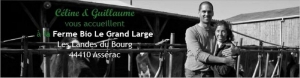 Guillaume et Céline ont repris la ferme le Grand Large à Assérac en 2010 et l'ont convertie à l'agriculture biologique de suite.L'activité principale de la ferme du Grand Large est la production laitière. Le lait cru bio, est produit par le troupeau de race Primholstein, composé d'une quarantaine de vaches. Un deuxième atelier est composé d'un troupeau d'allaitantes en race Highland Cattle, destiné à la vente en viande bouchère ou en animal d'élevage. Ces animaux sont par exemple utilisés comme "débrousailleuse écologique" sur les sites du conservatoire du littoral (Pen Bé, sur la commune d'Assérac et Pen Bron, à la Turballe).Les animaux sont élevés une partie de l'année sur les terres du conservatoire du littoral et sur l'exploitation pendant la période hivernale.De part leur éthique et leur engagement ils sont en auto-suffisance alimentaire, c'est à dire que leurs animaux mangent uniquement ce qui est produit sur leur exploitation. Les bovins sont nourris par le pâturage et du foin en hiver, ils ne consomment pas de céréales. Notre principal objectif est de produire une viande de qualité remarquable et pour cela nous travaillons sur le bien-être, la nourriture, la découpe, la maturation et la qualité du colisage final.Depuis 2007 ils proposent également des agneaux, ceux-ci sont élevés dans les parcelles du conservatoire du littoral à Pointe-Noire ou à Pont-Mahé, à Assérac. Les troupeaux sont garantis sanitaires et qualifiés indemne IBR.Vente de lait cru bio : directement à la ferme, pendant les heures de traite (apporter son contenant ; 1€ le litre)Vente de viande : sur commande par téléphone ou via le site internet de la Ferme du Grand Large. Colis de 10 kg de boeuf Highland cattle et agneau (par demi).