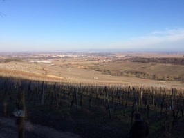 Depuis la colline du Dreispitz à Mutzig, le sentier de randonnée descendant vers le vignoble de Dorlisheim affiche une belle vue sur la plaine d'Alsace. Avec un ciel dégagé, il est possible d'apercevoir au loin la silhouette de la Cathédrale de Strasbourg.