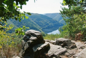 Un point de vue remarquable sur la retenue du barrage du Chastang et sur les pentes escarpées et boisées des Gorges de la Dordogne.