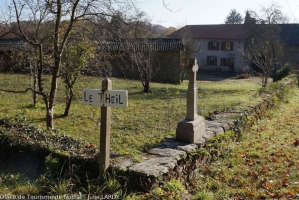 Petit hameau pittoresque avec d'anciennes fermes en pierre et une croix antique.