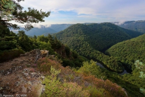 Point de vue de l’Echamel, falaise non sécurisée. Ce site remarquable de 7ha composé de falaises, de landes primaires et de bois de pentes est propriété du Conservatoire des Espaces Naturels de Nouvelle Aquitaine. Ces milieux typiques des gorges abritent de nombreuses espèces dont plusieurs rapaces tels que le Faucon pèlerin (Falco peregrinus), le Milan royal (Milvus milvus) et le rare Aigle botté (Hieraaetus pennatus).