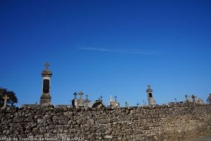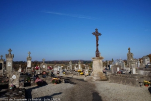 Située en haut du cimetière dans une des allées principales, la croix monumentale se dresse sur plusieurs mètres. Construite en granite en 1899, elle est surmontée d’un Christ en croix en fonte. Autour de la croix, des pierres tombales sont sculptées en granite et portent des plaques de porcelaine peintes. Caractéristiques des cimetières du secteur de Limoges, ces plaques témoignent de l’importance de l’industrie porcelainière dans la région, de l’art funéraire ainsi que de la grande et petite histoire.