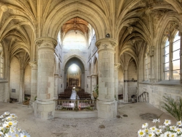 Une première église avait été construite vers 840 mais elle fut détruite lors du siège de Philippe Auguste puis reconstruite en 1204. Elle fut assiégée en 1417 par les anglais ; la nef et le chœur ont été une nouvelle fois reconstruits entre 1438 et 1510. A partir de 1543, construction de la chapelle absidiale, dédiée au St Sacrement et à la vierge, avec pour pouvoir y accéder un déambulatoire, surélevé par rapport au choeur. Cet ensemble a été, en effet, construit pour laisser libre passage à la rue, qui passe en dessous, sous une arche.A voir les gargouilles sur le bas côté droit et les petits personnages sculptés.